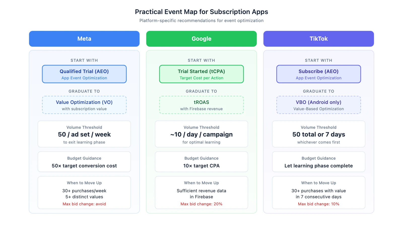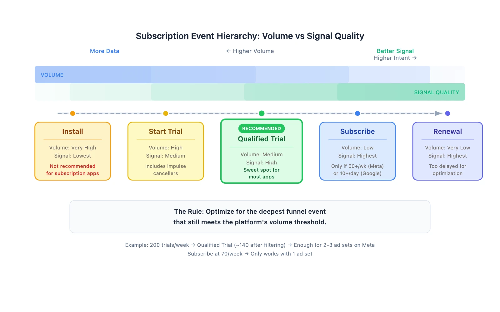 For a fitness app generating 200 trials/week: Qualified Trial (filtering ~30% impulse cancellers) yields ~140 events/week — enough for 2-3 ad sets on Meta. Subscribe at 70/week only works with 1 ad set. The event choice directly constrains your campaign structure.