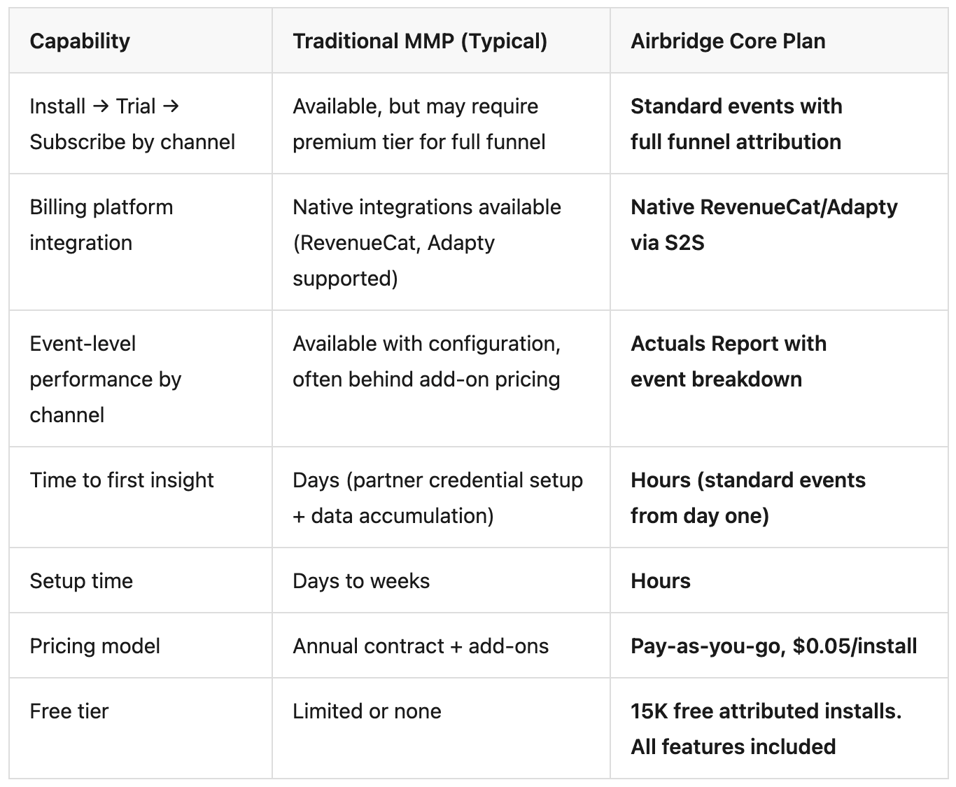 Core Plan tracks Install, Start Trial, and Subscribe as standard events with attribution across Meta, Google, Apple Search Ads, and TikTok. The Actuals Report shows conversion rates at each funnel stage by channel — so you can see whether your event strategy is actually driving subscribers, not just the event you optimized for.