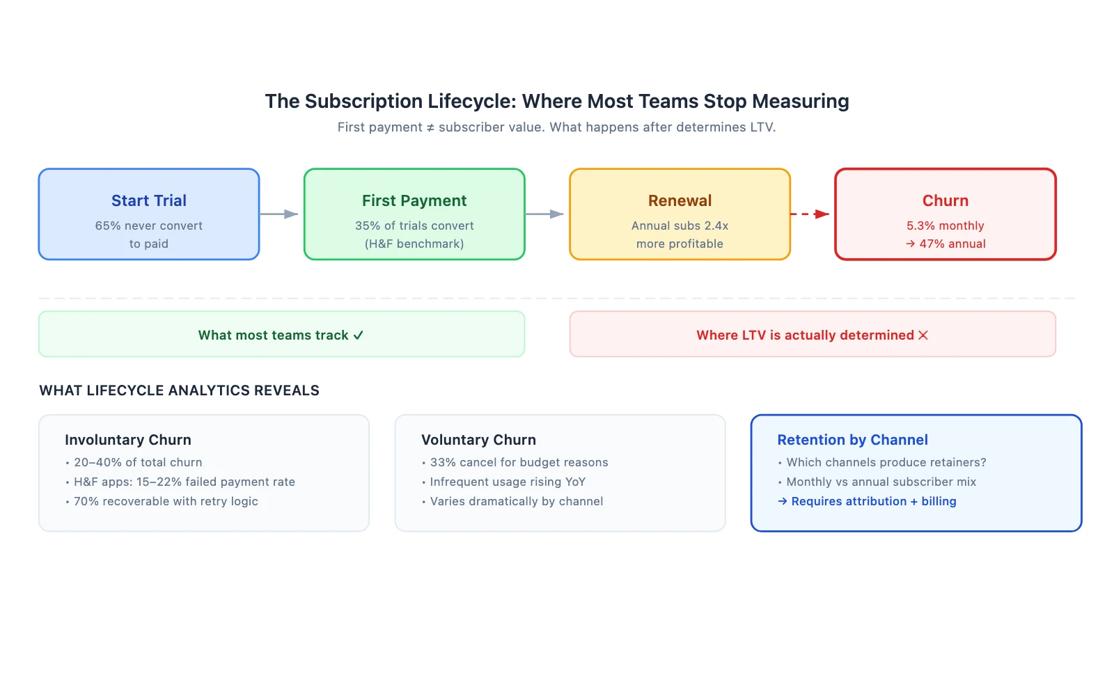 This is the gap that subscription lifecycle analytics fills. It is not a single metric. It is the practice of tracking every revenue-relevant event from trial to renewal to churn — and connecting each event back to the channel that acquired the user.