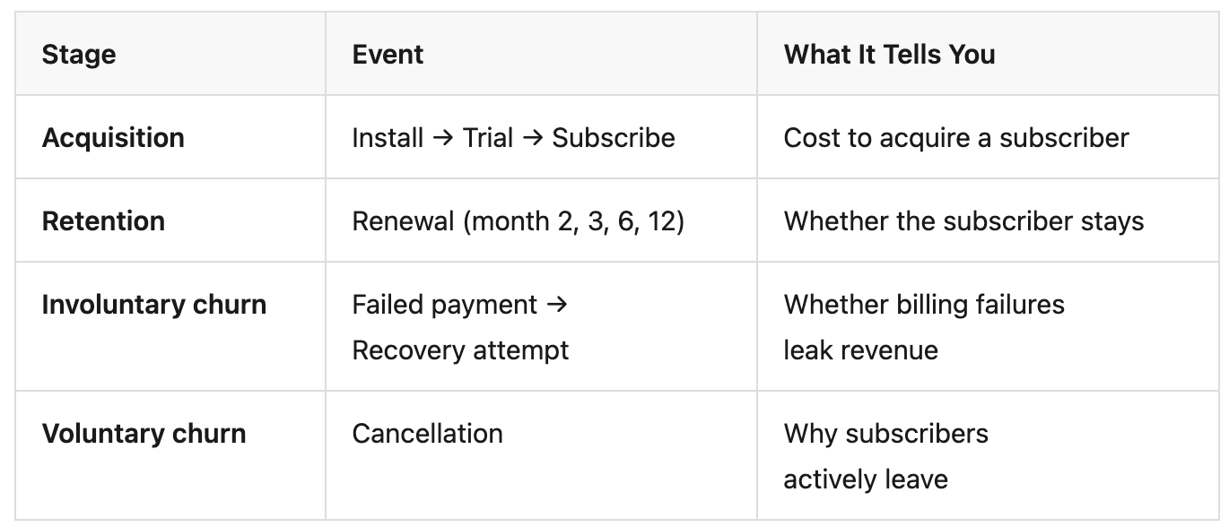 These three events tell you how much it costs to acquire a subscriber. They tell you nothing about what that subscriber is worth. A subscriber who cancels after one month has a completely different LTV than one who renews for a year — but at the point of first payment, they look identical.