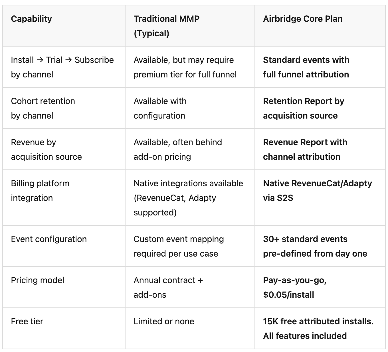 Core Plan tracks Install, Start Trial, Subscribe, and Unsubscribe as standard events with attribution across Meta, Google, Apple Search Ads, and TikTok. With native RevenueCat and Adapty integration via S2S, subscription lifecycle events flow into attribution automatically.