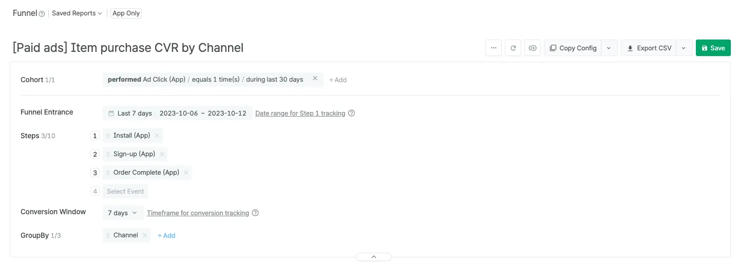 For example, let’s say your goal is to examine the conversion rate of users acquired from paid ads within the past seven days and subsequently made a purchase. To optimize your performance across various marketing channels, you can structure your funnel analysis stages on Airbridge as follows: