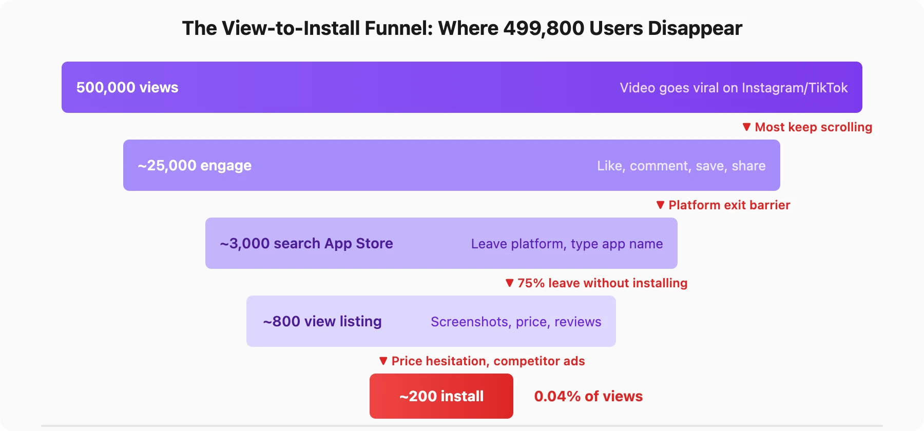 Step 1: Platform exit. The user sees the video on Instagram or TikTok. To install your app, they must leave the platform. Most do not. Social platforms are designed to keep users scrolling — every swipe-up, link-in-bio tap, or App Store search requires the user to actively interrupt their feed behavior. Most users save the video and move on.