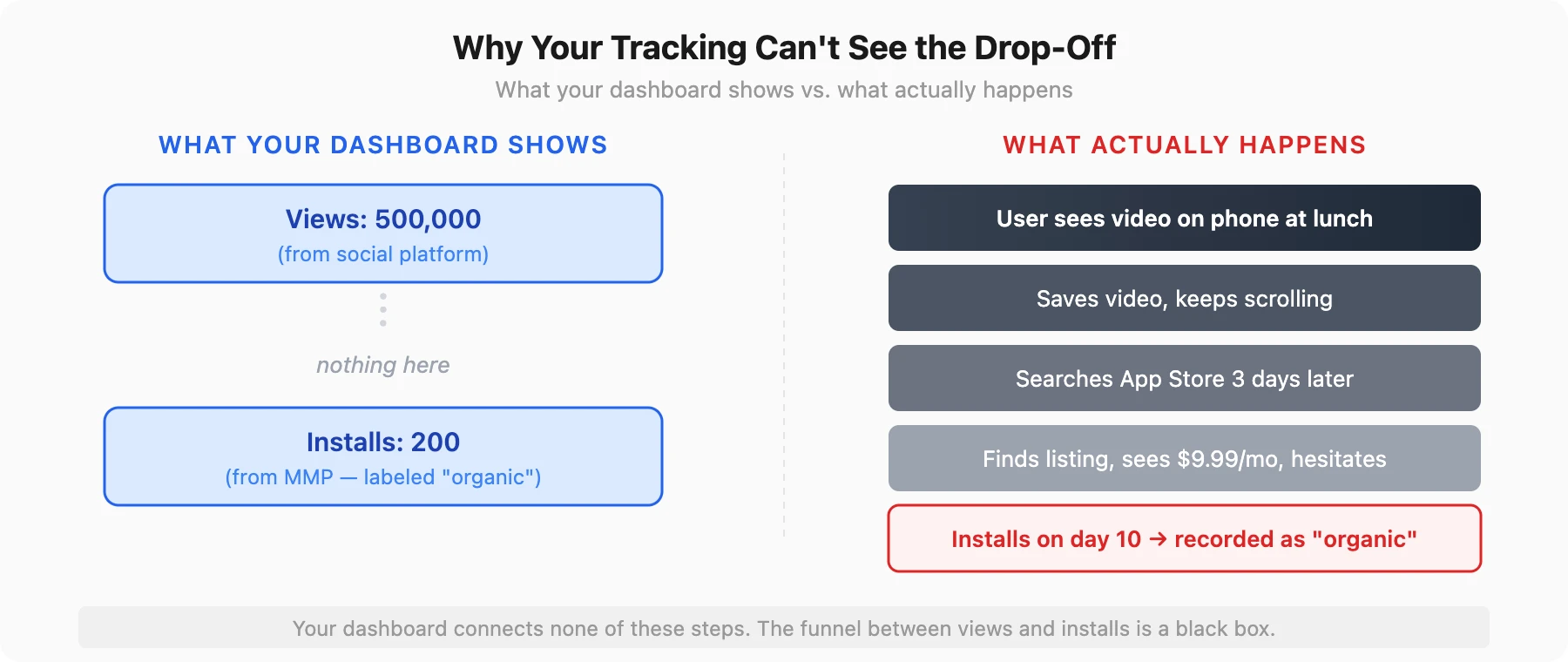 You see totals, not the funnel. Most dashboards show views (from the social platform) and installs (from the MMP). Everything in between — platform exits, App Store page visits, search queries, delayed decisions — is a black box. You cannot optimize a funnel you cannot see.