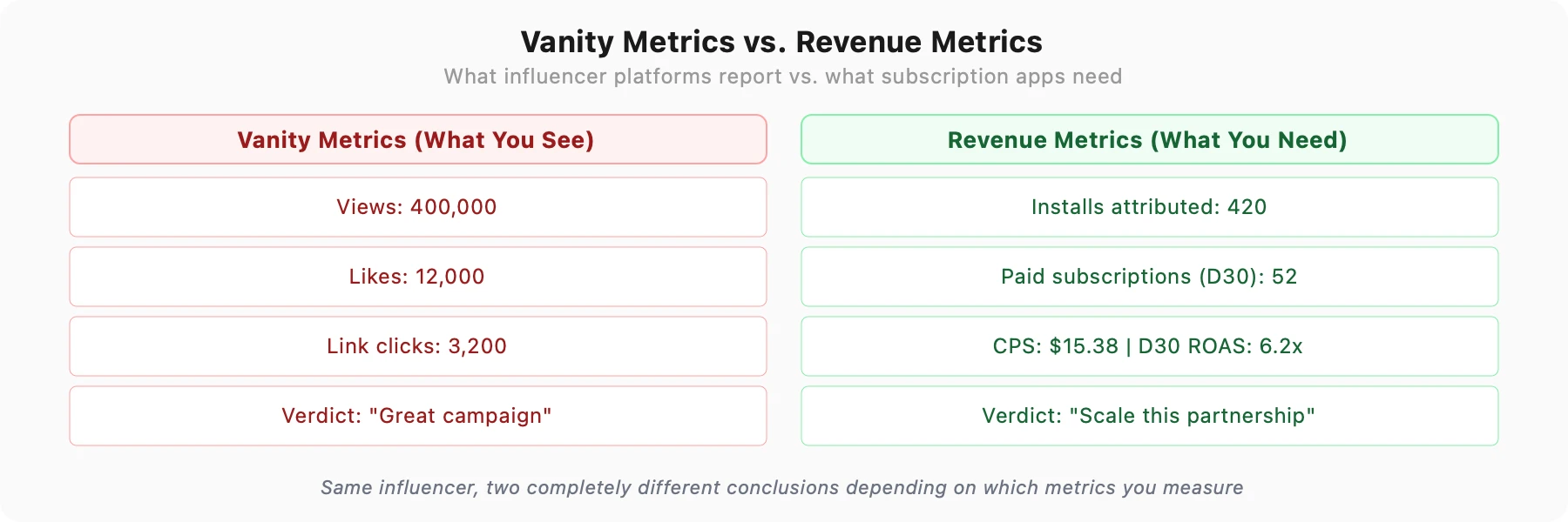 When your measurement stops at likes, views, and installs, you make investment decisions with incomplete data. The influencer who generates 400,000 views and 22 paid subscriptions looks better than the one who generates 28,000 views and 52 paid subscriptions, until you see the subscription data.