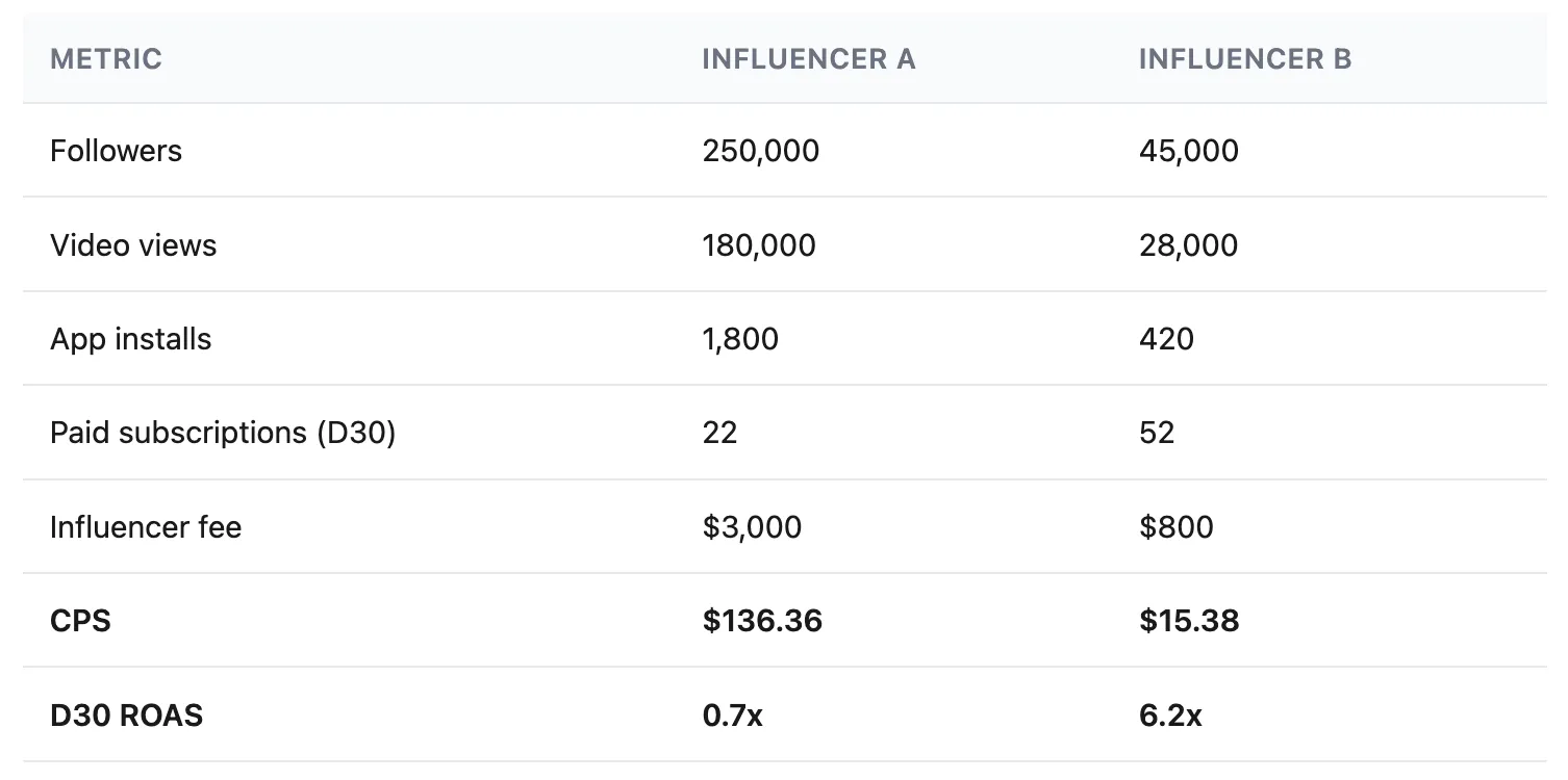 Influencer A wins on every engagement metric. But Influencer B produces more than twice as many paying subscribers at less than a quarter of the cost. If your measurement stops at the install or trial level, you would scale spend on Influencer A and cut Influencer B.