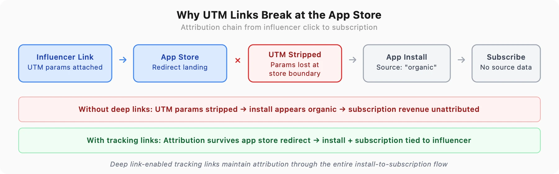 The install appears as organic. The influencer receives no attribution credit. If the user later subscribes, that subscription revenue is invisible to the measurement system.