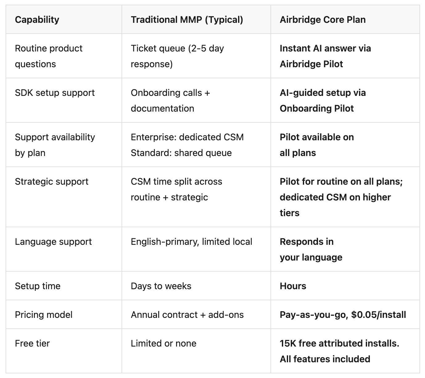 Pilot and Onboarding Pilot are available on every plan — including Core Plan. For teams that need deeper, strategic support, Airbridge's higher-tier plans include dedicated Customer Success Managers who focus on the problems that actually require human expertise: