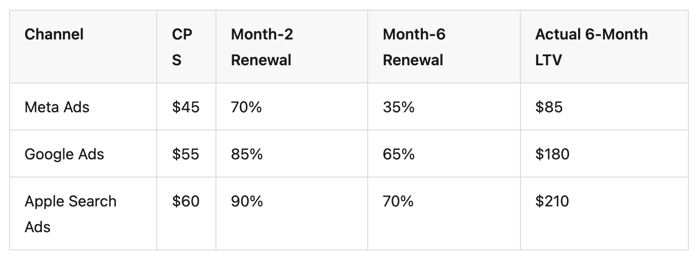 In this hypothetical example, Meta has the lowest CPS but the lowest 6-month LTV. Apple Search Ads has the highest CPS but produces subscribers worth 2.5x more over 6 months. A CPS-only budget decision would scale Meta and cut ASA — the opposite of what the lifecycle data recommends.