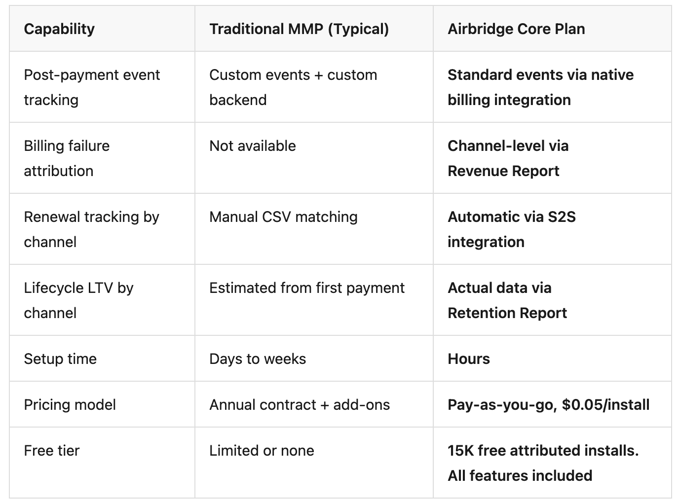 The post-payment blind spot exists because most MMPs were built for acquisition attribution, not subscription lifecycle tracking. Here is how Core Plan addresses the gaps.