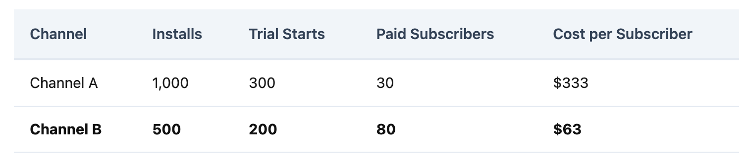 If your MMP only shows install data, Channel A looks like the winner — double the installs. But Channel B produces 2.7x more paying subscribers at one-fifth the cost. Without subscription-level attribution, budget flows to Channel A for months before anyone catches the mistake.
