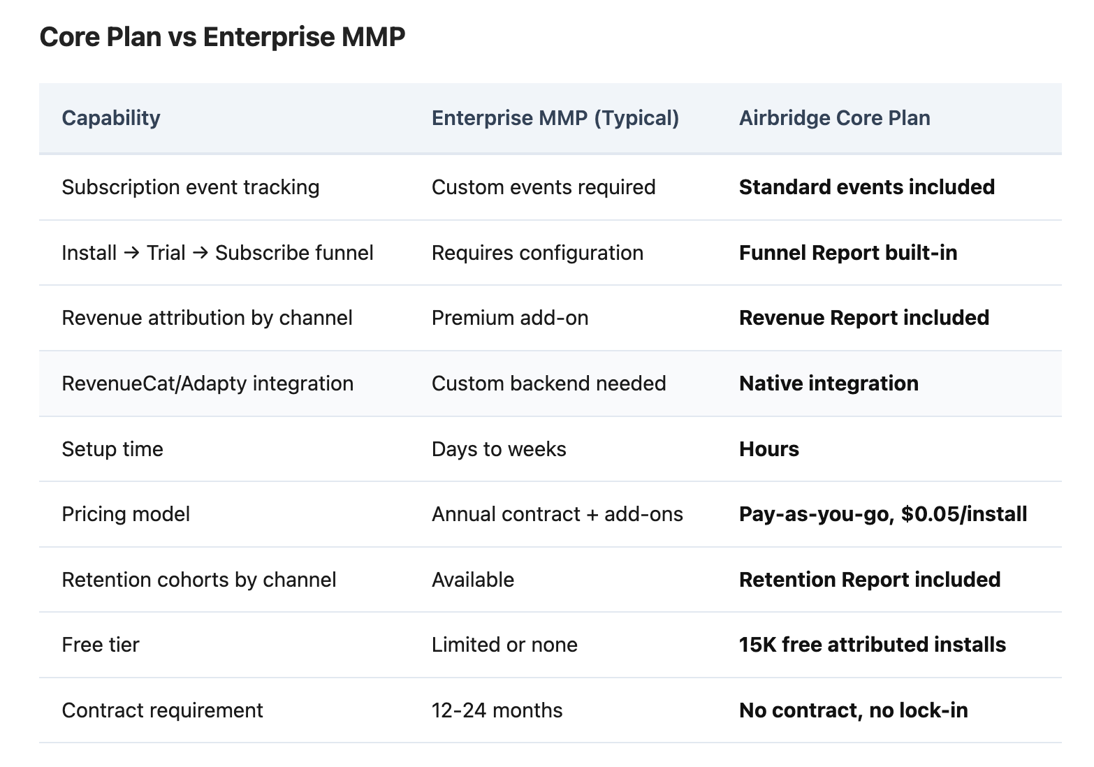 Core Plan covers the subscription attribution baseline: standard events, GMAT channels (Google, Meta, Apple Search Ads, TikTok), RevenueCat/Adapty integration, and 6 reports. Consider upgrading when you need custom event tracking, fraud detection, raw data export, or attribution for ad networks beyond GMAT. These are Growth Plan capabilities designed for teams at a different maturity stage.