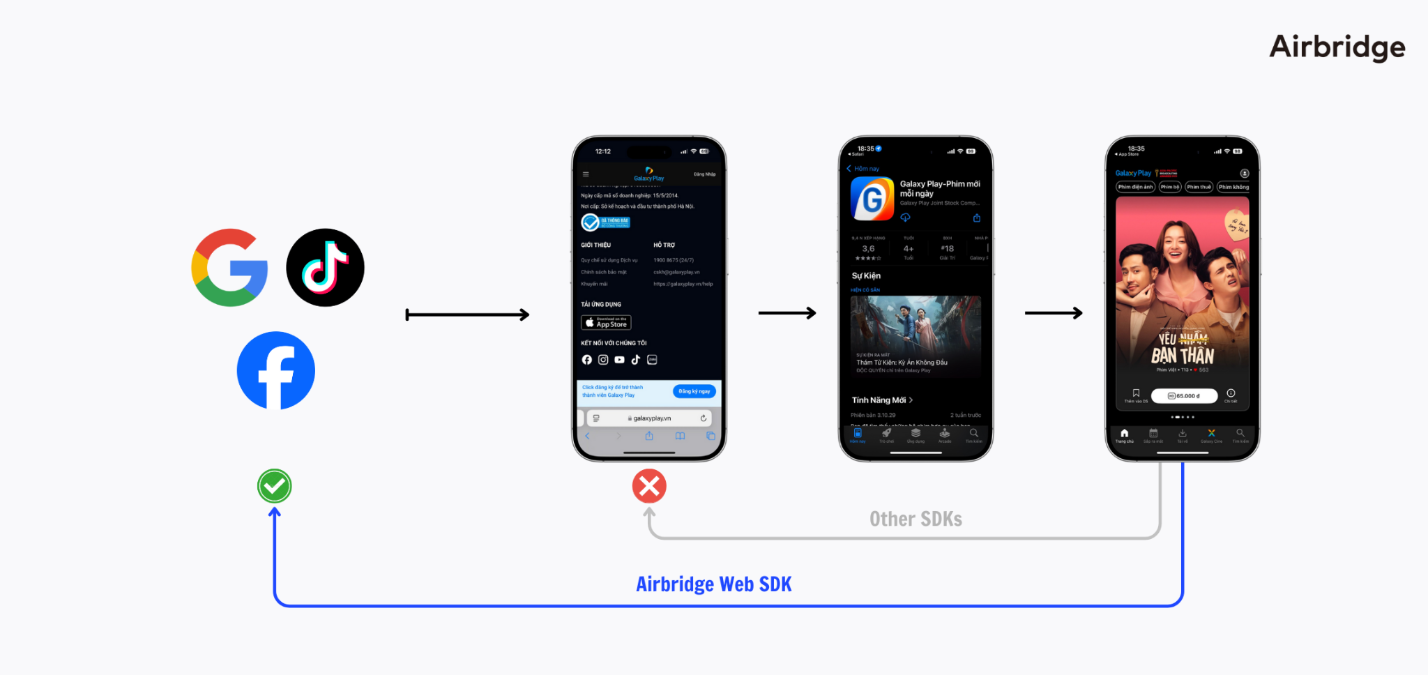 Airbridge implemented the Web SDK for Galaxy Play, enabling first-party data collection instead of relying on cookies or third-party sources. When users move from web to app, Airbridge analyzes multiple signals, including UTM parameters, device information, timestamps, and IP addresses, to accurately identify the original ad source.