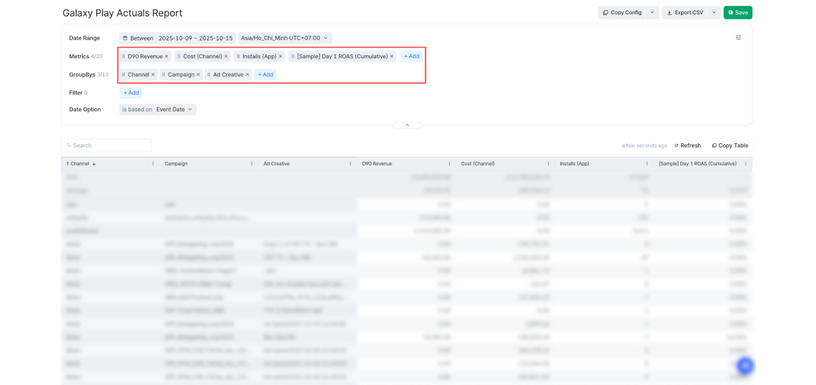 Managing data from more than 20 partners also became far simpler with the Actuals Report, where all key metrics, including cost, cohort revenue, installs, and ROAS, are consolidated into a single dashboard. Galaxy Play can customize GroupBy settings by Channel, Campaign, or Creative to identify the top-performing sources and redistribute budgets quickly. This allows the team to compare MMP data with CRM data and pinpoint the most efficient channels in real time.