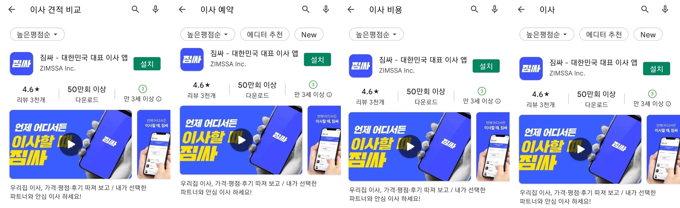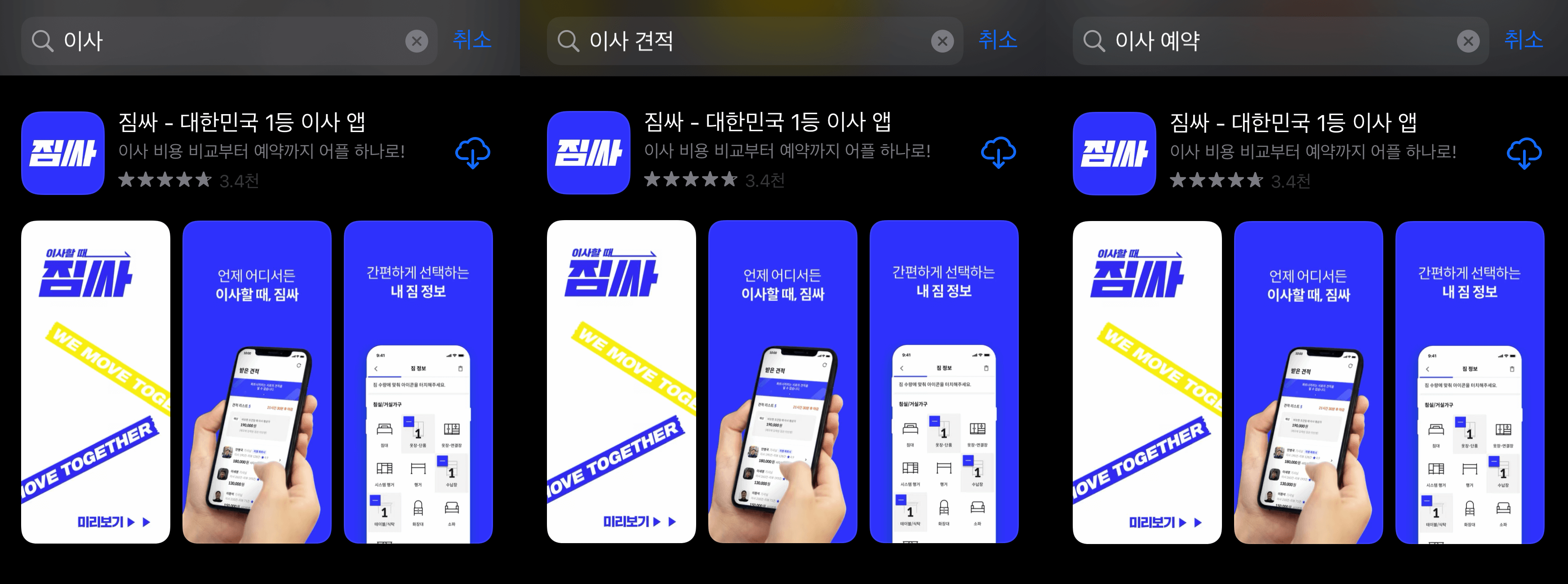 예를 들어, App Store 및 Google Play에 '이사, 이사 견적, 이사 비용' 등을 검색하면 에어브릿지(Airbridge) 고객사인 '짐싸'가 검색 결과가 최상단에 뜹니다. (2021.12.13 기준) 짐싸는 '이사, 이사 견적, 이사 비용' 등에 대한 키워드에 대해 우위를 선점하고 있음을 알 수 있습니다.