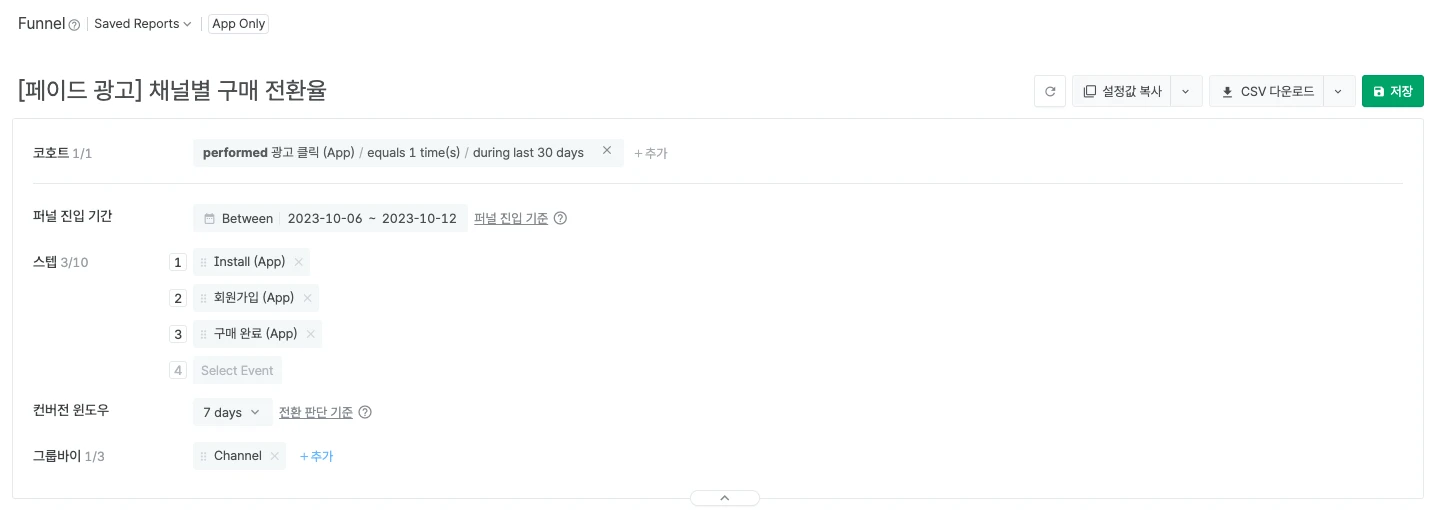 퍼널 분석 단계 설정이 완료되었다면 정의한 단계에 따라 필요한 데이터를 수집하고 분석을 시작하면 됩니다.