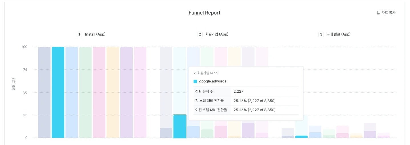 이 퍼널 분석 기능은 프로덕트 분석 툴 외에도 광고부터 이어지는 앱 내 여정을 분석하기 위해 MMP/어트리뷰션 툴을 사용할 수도 있습니다. 에어브릿지가 제공하는 퍼널 리포트 및 기능은 대부분의 MMP에서는 제공하지 않으며, 에어브릿지가 유일합니다.