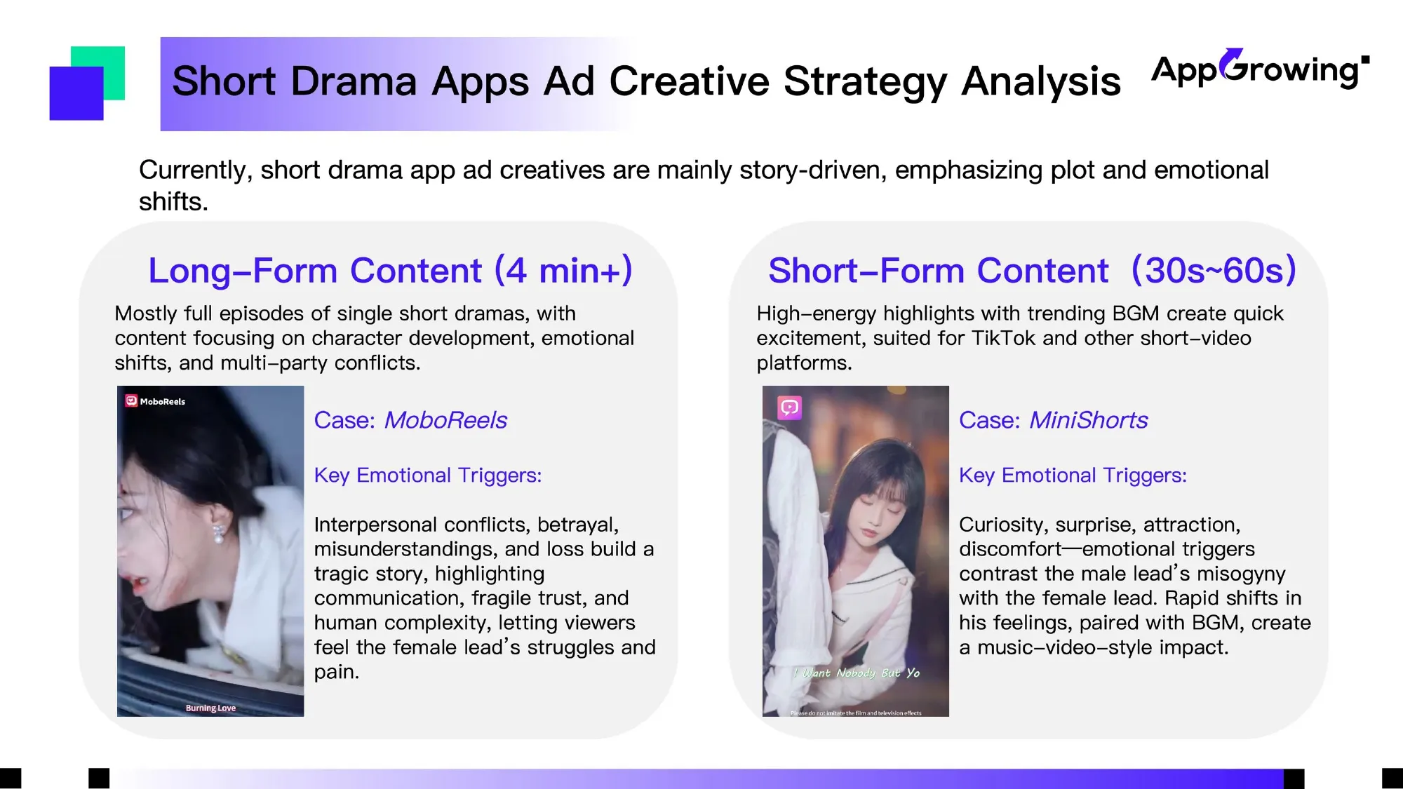 최근 전 세계를 강타하고 있는 숏드라마 시장에 대한 이야기도 빠질 수 없는데요. 숏드라마 앱 마케팅의 핵심은 결국 오리지널 콘텐츠예요. 어떤 스토리가 유행하는지 파악하는 것이 곧 마케팅 전략이죠. 재미있는 점은 영상 길이에 따른 훅(Hook)의 법칙이었어요. 숏드라마 광고는 영상 길이에 따라 전략이 완전히 달라요.