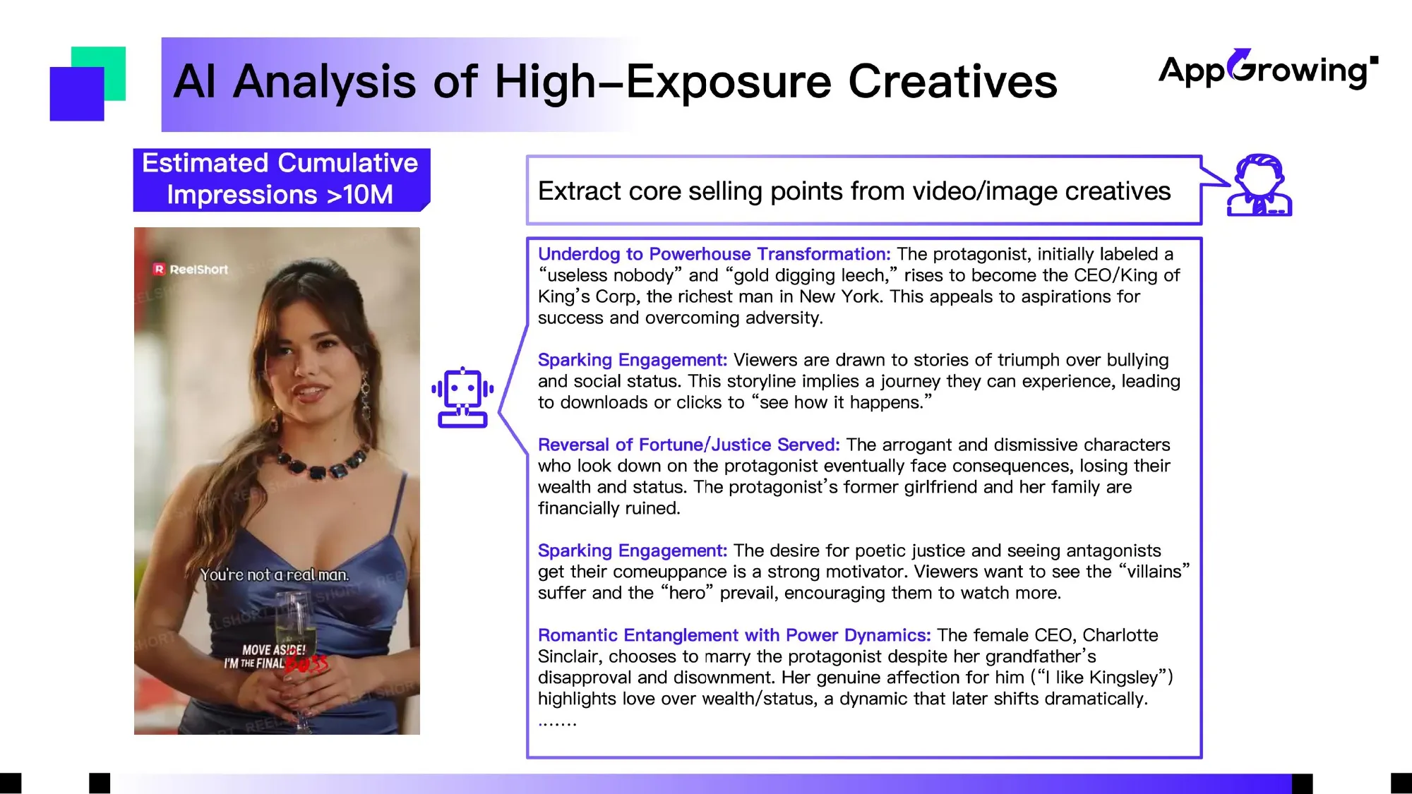 하지만 이제는 앱그로잉 AI 에이전트에게 이 소재가 왜 잘 됐는지 물어보면 “복수극 테마에 반전 요소가 있고, 초반 3초에 강렬한 사투리를 썼기 때문입니다.”라고 즉시 분석해 준다고 해요.