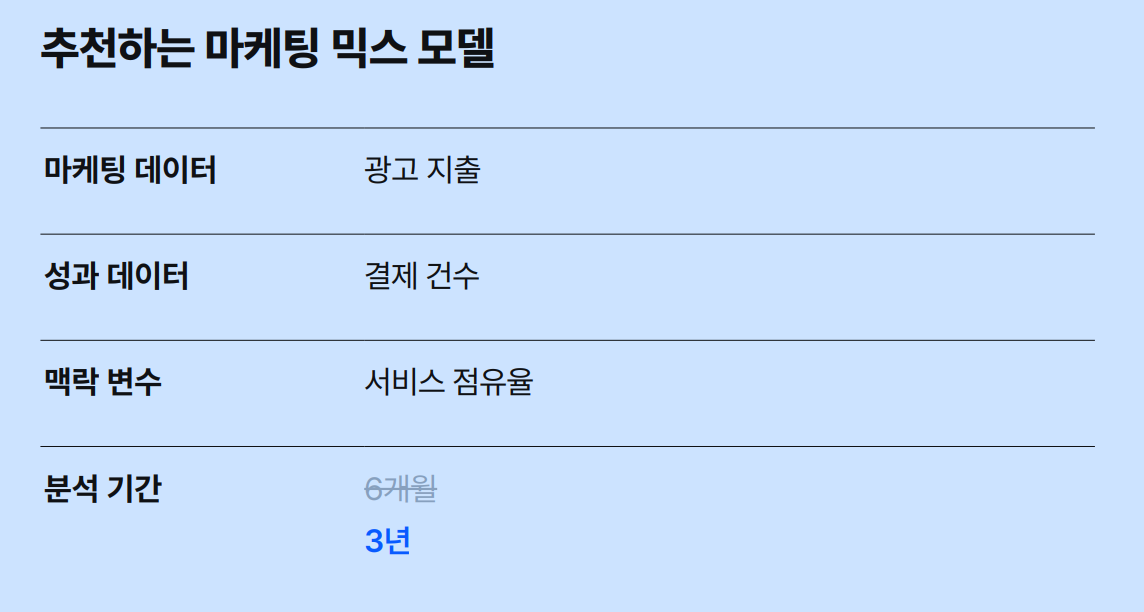 따라서 장기간 트렌드를 분석하여 마케팅 믹스 모델에 적용하였습니다. 간편 결제 서비스를 출시한 이후 3년 치의 데이터를 통해 결제량이 연말과 연초에 증가하고, 4~10월에 저조했다는 것을 알 수 있었습니다. 장기적인 트렌드 반영으로 더 신뢰할 수 있는 광고 성과를 확인했습니다.