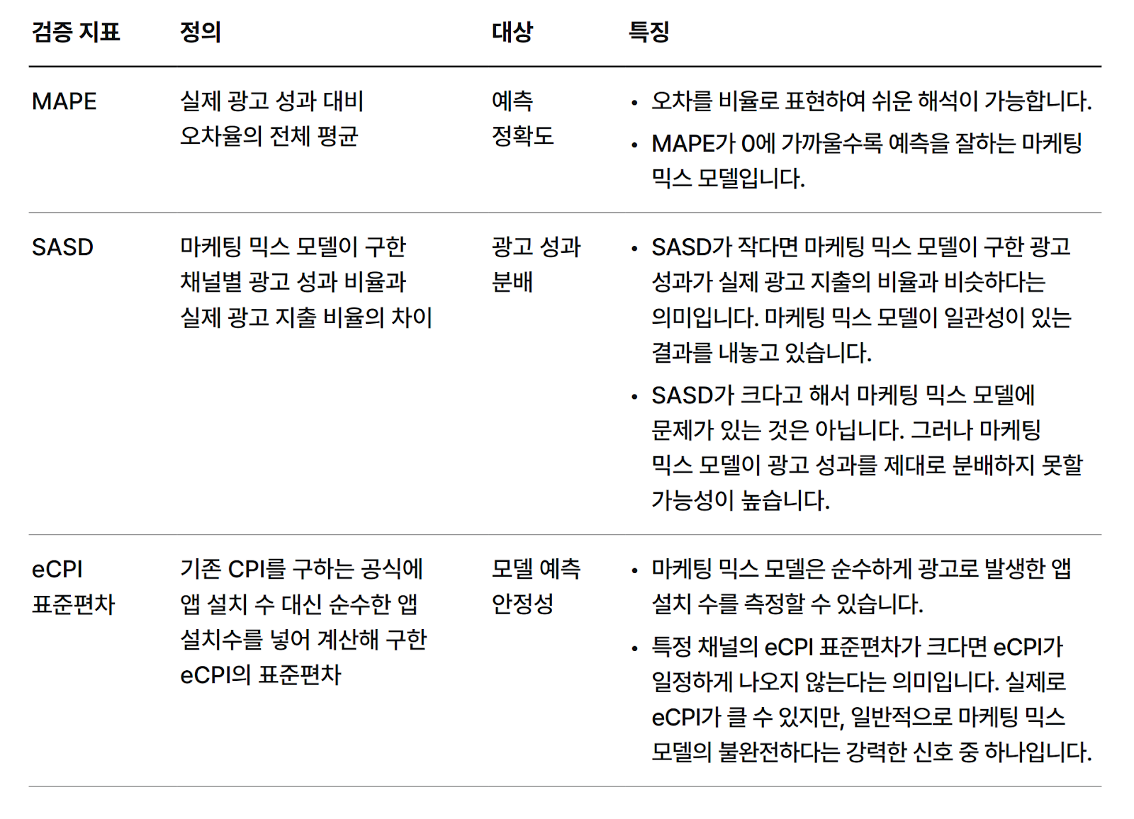 또한 한번의 회귀 분석으로 구한 선형 함수를 정확한 수식으로 보기 어렵습니다. 우리가 구한 선형 함수가 마케터가 준비한 데이터에 숨겨진 패턴을 잘 설명하는지 확인하는 과정이 필요합니다. 이러한 검증에 자주 사용되는 지표는 다음과 같습니다.