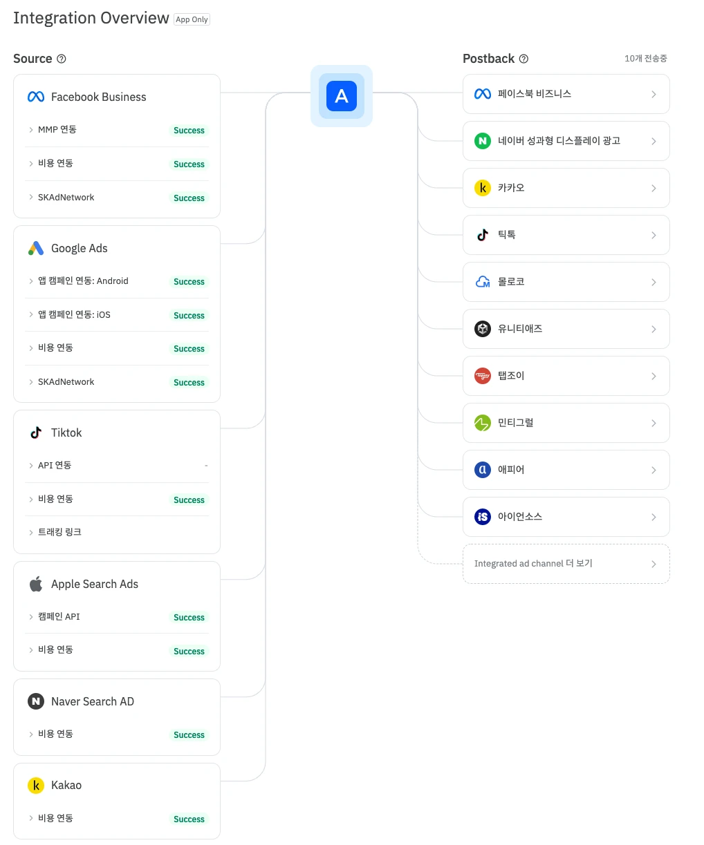 연동되어 있는 광고 채널과 포스트백 전송 채널 현황을 직관적으로 파악할 수 있는 Integration Overview 기능이 정식 배포되었습니다! 이제 각 광고 채널 데이터가 에어브릿지와 잘 연결되어 있는지 실시간으로 확인할 수 있습니다.