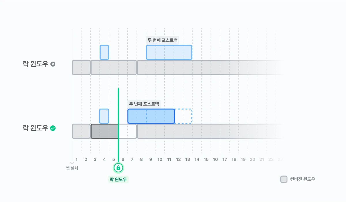 두 번째 포스트백과 세 번째 포스트백을 너무 늦게 확인할 수 있다고 생각할 수 있습니다. 예를 들어 앱 설치 후 4일차에 측정된 데이터를 확인하고 싶어도 마케터는 두 번째 컨버전 윈도우가 끝나는 최소 7일차까지 기다려야 합니다. 세 번째 컨버전 윈도우가 진행 중이라면 1달 넘게 기다려야 합니다. 이런 상황을 해결할 수 있는 기능이 있습니다. 바로 락 윈도우(Lock Window)입니다.