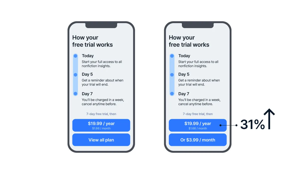 Indeed, there was a productivity app that drove conversion by changing the number of plans displayed. The original paywall only showed the yearly plan, whereas the revised paywall showed both the yearly and monthly plans, as in the image below. This allowed users to see where the value was; with the two plans juxtaposed, users could not help but compare the prices and found the latter to be more cost-effective. Eventually, the app saw a 31% increase in yearly subscriptions.