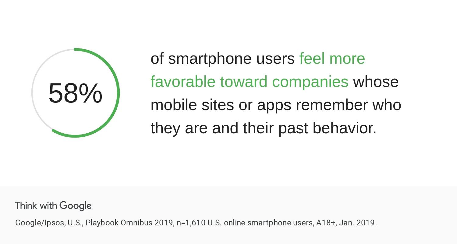 Customer’s data is also valuable for providing personalized experience to customers. The customer information and data collected from each product enable more sophisticated and customized user experience as well as personalized marketing campaigns. According to the research results provided by Think with Google, 58% of smartphone users feel more favorable towards companies whose mobile sites or apps remember who they are and their past behavior. This puts into perspective how much personalized experience based on customer behavior is important.
